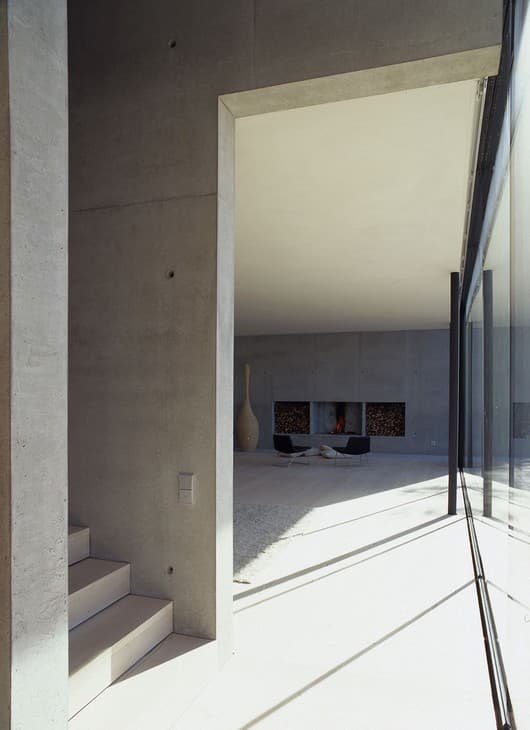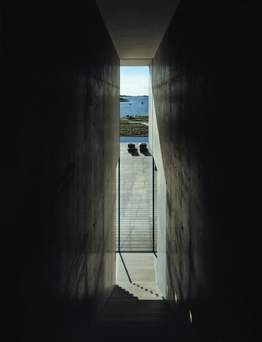 Villa Ann posee una planta muy simple: un salón y la cocina en planta baja y dos dormitorios en planta alta, todos de generosas proporciones. Está totalmente orientada al mar, al oeste, y lo único que separa el interior del exterior es una ‘membrana’ continua de vidrio. La construcción de hormigón y cristal generan el contraste, delgado y grueso, cerrado y abierto, natural y artificial. En los suelos, en las divisiones, y en las mesas del interior domina el abeto muy claro y pulido.