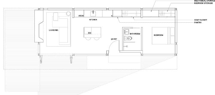 El plano y renders corresponden al modelo básico Módulo A, que tiene una superficie de 58,5m2. Se vende por unos $129.000 -excluido el transporte y trabajos en el sitio-. En ese espacio se distribuye una vivienda de un dormitorio; el resto funciona como sala de estar, comedor y cocina, incluyendo numerosos armarios empotrados para almacenaje. El cuarto de baño está bien proporcionado al tamaño del edificio, con ducha en vez de bañera. Las fachadas más acristaladas dan a una plataforma de madera exterior que sirve de terraza y que, junto con el gran voladizo de la cubierta, forma un lugar agradable para disfrutar al aire libre.
