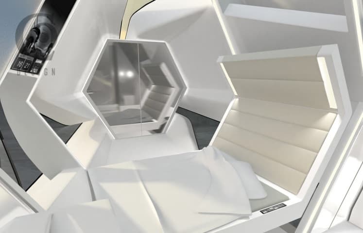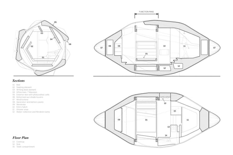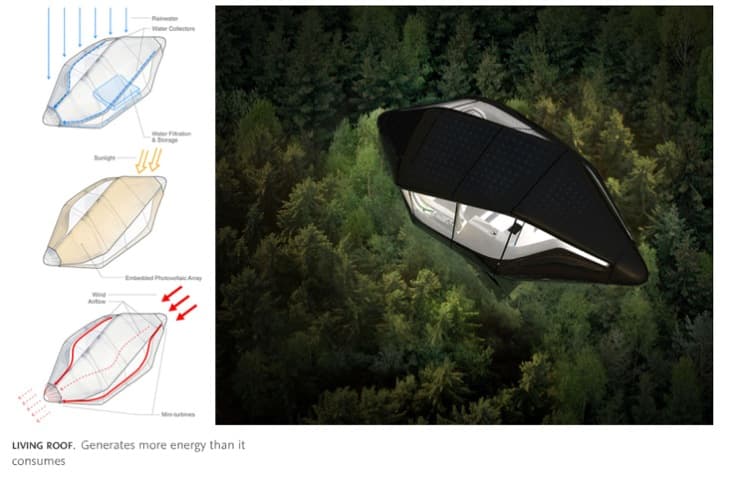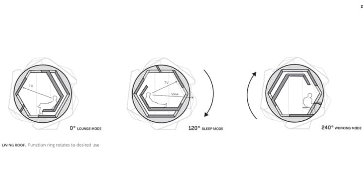 Con una longitud de unos 8.5 metros, Living Roof tiene una forma que recuerda a la de una semilla. Su sección es casi hexagonal, y con unos bellos huecos acristalados repartidos por su superficie. En sus extremos posee unas turbinas eólicas, aunque también está capacitada para recoger, almacenar, y tratar el agua de lluvia. Esto último esta reflejado en uno de los esquemas técnicos. Su interior se ve confortable, en la línea de lo que vemos por fuera, con todo el mobiliario integrado en su diseño. Dispone de aseo y espacio para cocinar. Uno de los aspectos más interesantes es un anillo interior que tiene tres posiciones (0º, 120º, 240º) haciendo aparecer una cama, un sillón, o liberando espacio para poder utilizar el escritorio. Todo es realmente ingenioso.
