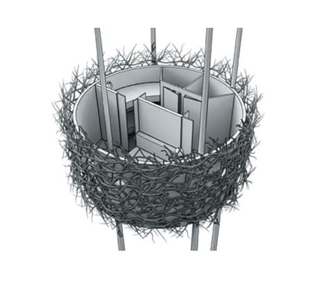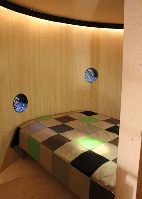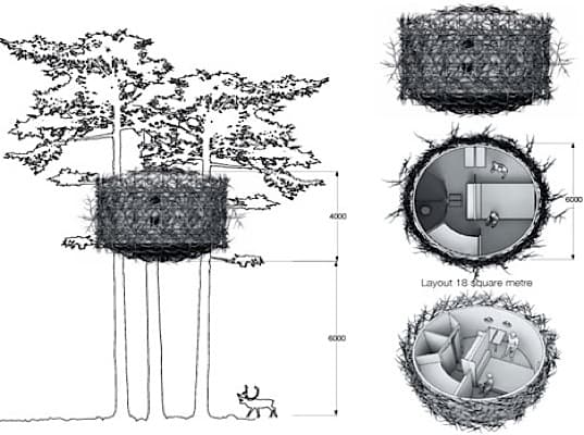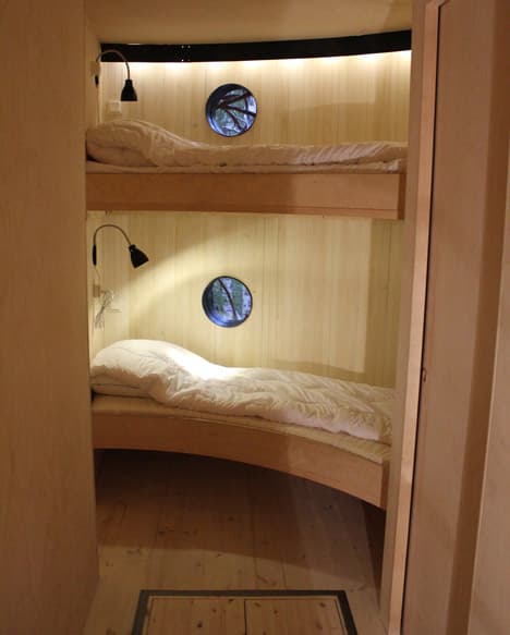 La habitación nido de pájaro tiene un diseño bastante rotundo (y redondo). Conforma un espacio de 18 metros cuadrados, con capacidad para una pareja con dos hijos. Cuenta con dormitorio independiente de cama grande, y unas dos camas aparte dispuestas en forma de litera. Hay también dos pequeñas cabinas, supuestamente para ducha e inodoro (de compostaje?). El interior está revestido de madera, pero en versión sencilla y no tan ‘natural’ como la que se ha elegido para el exterior, que está literalmente cubierto de ramas secas. Su acceso se realiza a través de una escalera retráctil.
