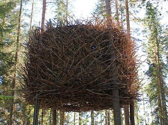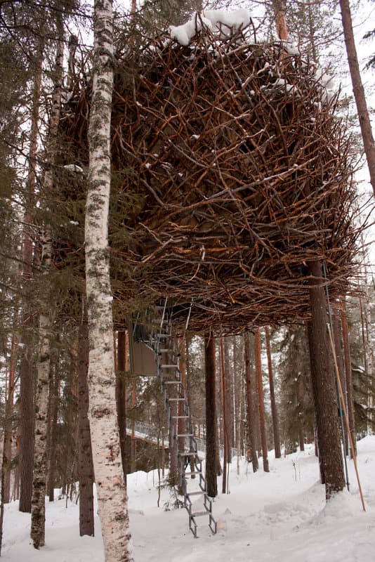 Este post está dedicado a un «nido de pájaro» muy peculiar, ubicado entre árboles y colgado a seis metros del terreno. Se trata en realidad de una habitación del famoso Treehotel. Ese lugar es conocido por sus alojamientos sostenibles/sustentables, muy cerca del Círculo Polar Ártico (Harads, Suecia). Todas sus habitaciones se caracterizan por tener un diseño bastante exclusivo, y The Bird’s Nest no iba a ser menos.