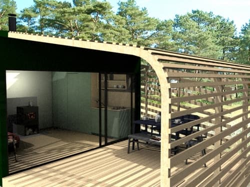 Estas imágenes corresponden a un modelo escandinavo de cabaña prefabricada que tiene una superficie de 15 metros cuadrados. Es Mini House, y se creó como una construcción realmente sencilla, con cubierta a dos aguas. Incluye una terraza (también de 15m2) con pérgola de madera. Por sus dimensiones, es una estructura prefabricada que no va a necesitar permiso de construcción casi en ningún sitio.