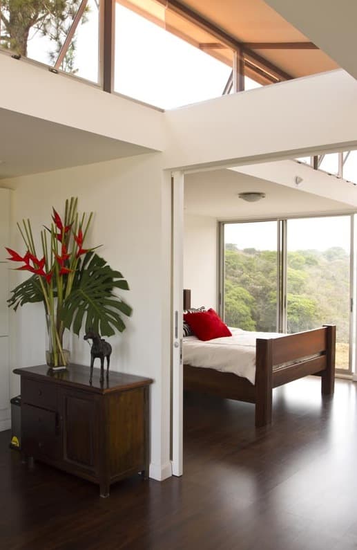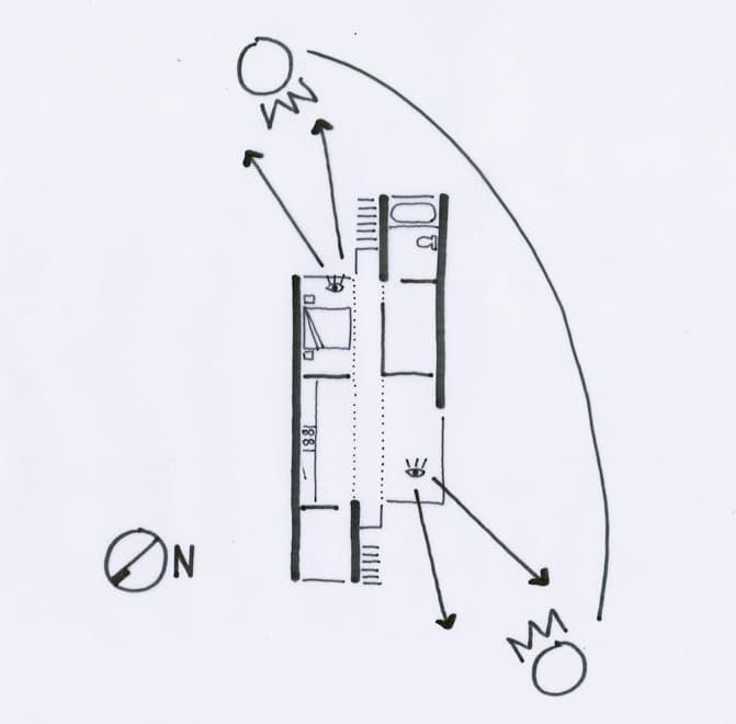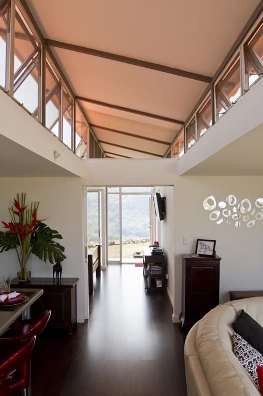 La organización y distribución de ventanas está pensada para no perder las vistas hacia la salida y puesta del sol. Al mismo tiempo se crea un interior confortable, mediante un acondicionamiento solar pasivo. En esto último tiene un papel muy importante el lucernario central, que ayuda en la ventilación cruzada de la casa. De esa manera se ahorra energía en refrigeración.