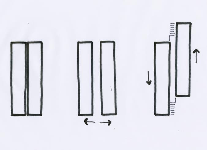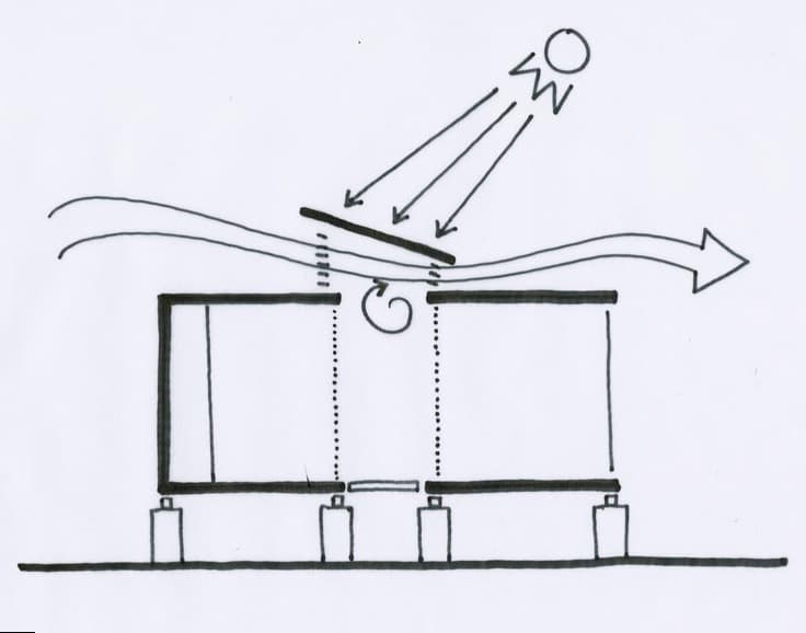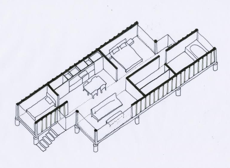 Los propietarios optaron por una solución económica ($40.000) a partir de la reutilización de dos contenedores de carga de 40 pies. Los módulos están ligeramente separados y desplazados el uno del otro, y apoyados sobre unos soportes de hormigón. Con esa disposición se creó un espacio interior mucho más habitable. Para lograrlo, a cada contenedor se le cortó parte de sus laterales, pero ese material sirvió luego para formar la cubierta del gran hueco abierto en el centro del edificio. Los esquemas y dibujos son bastante explicativos.