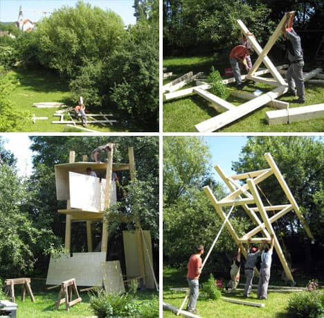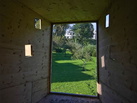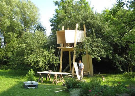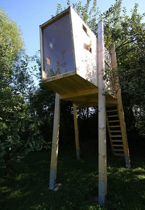 Esta estructura de madera difícilmente la podríamos archivar dentro de la categoría de casas diminutas. Tampoco entraría en la de casas en los árboles, sencillamente porque se trata de un espacio que es auto-portante. Es un refugio que no necesita de ningún árbol para instalarse. El habitáculo se compone de una caja con forma irregular, apoyada sobre una plataforma anclada a cuatro postes de madera. Tiene todo el frontal delantero acristalado, además de ventanas pequeñas laterales para facilitar su ventilación. Eso sí, es necesaria una pequeña cimentación de hormigón (zapatas) en cada uno de los soportes.