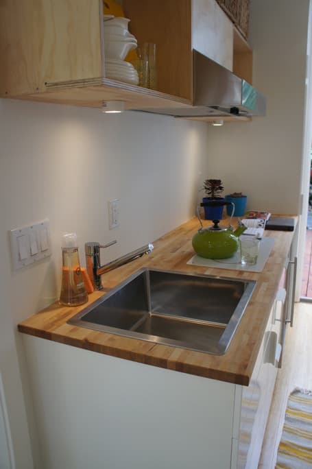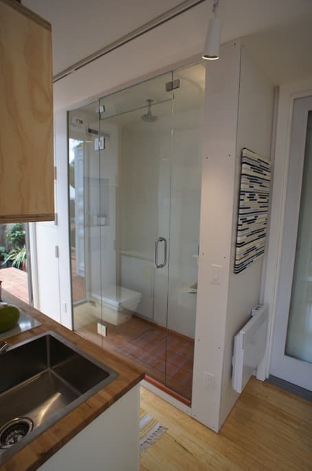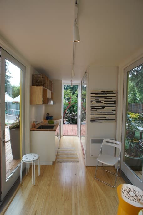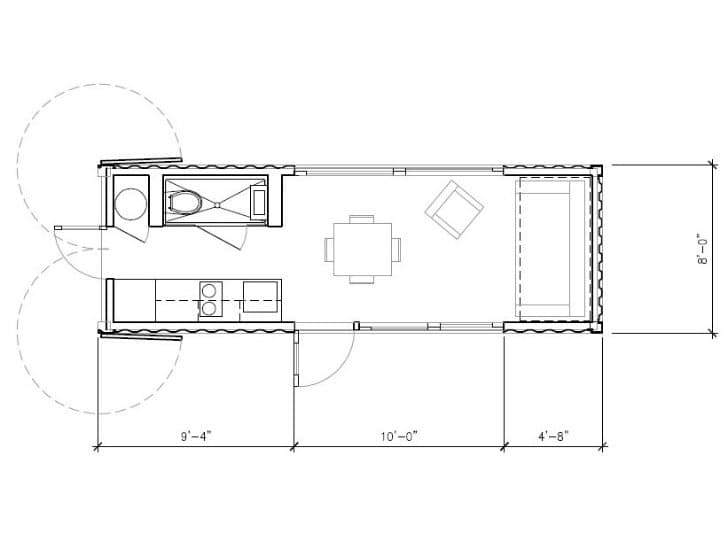 El contenedor se ha alterado para añadirle grandes huecos con puertas acristaladas. Pero las partes cortadas aún las conserva como puertas exteriores abatibles y deslizantes. Esto hace posible cerrar la casa cuando no se utilice. Fuera hay espacio para una gran terraza con el piso de madera, y dentro encontramos una pequeña cocina, cuarto de baño, y armario para almacenamiento. El resto se utiliza como salón y dormitorio (sofá-cama). El aseo es realmente una cabina de ducha con inodoro y lavabo.