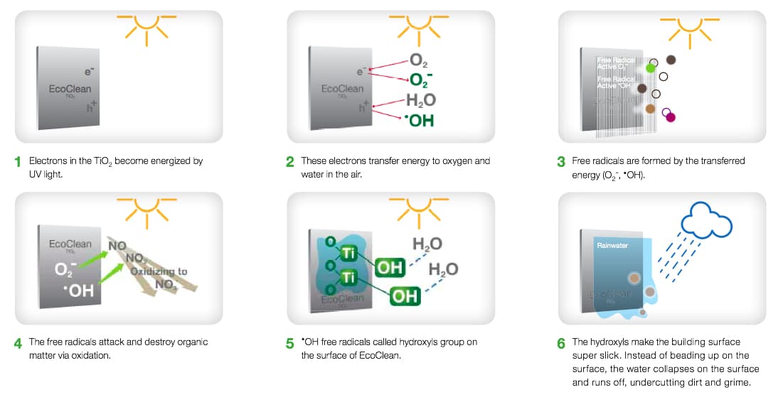 No es la primera vez que escribimos sobre un producto de estas características. Recordemos que el sistema Bionictile de Ceracasa es un producto que descontamina el aire de óxidos de nitrógeno, y los convierte en nitratos. Con Ecoclean, aparte de neutralizar los óxidos de nitrógeno (NOx), también actúa sobre los óxidos de azufre (SOx), y mantiene la fachada del edificio limpia. Es toda una genialidad.
