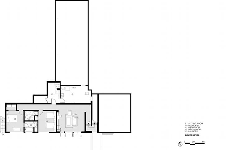 La entrada se hace por el nivel superior, el que tiene su fachada revestida por acero corten y madera de cumaru. Esta planta es la que contiene la vivienda propiamente dicha. El piso inferior, aparte de tener el lavadero y cuarto de instalaciones, es una suite para invitados (se alquila) que funciona totalmente independiente. Esta organización permite ahorrar energía cuando no hay clientes. La distribución en ambos casos es bastante sencilla, como se puede ver en los planos de planta. El piso principal el que se lleva la mejor parte en todo, pero con un solo dormitorio.