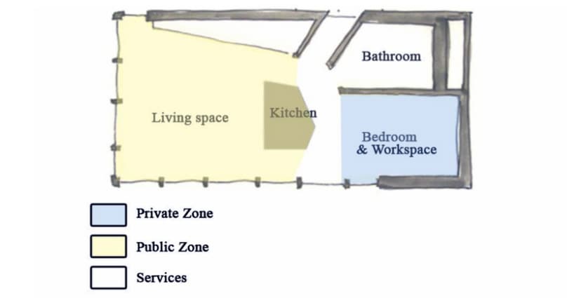 Relativo a sus aspectos sostenibles, la casa SLIDE-S maximiza el uso de la ventilación natural y la refrigeración. De esa manera reduce la cantidad de energía necesaria para hacer funcionar el aparato de aire acondicionado. Las aguas grises son filtradas y almacenadas para su posterior reutilización en el riego por goteo y la cisterna del inodoro. Este equipo realizó unos esquemas que explican el funcionamiento pasivo de la casa, tanto en verano como en invierno, y en horas diurnas y nocturnas. Recordemos que todo ello controlado por el deslizamiento de su capa exterior.