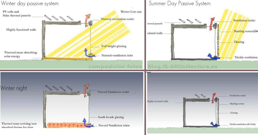 Durante el día de verano, la pantalla está cerrada, para impedir que la temperatura interior aumente, permitiendo que el aire caliente escape por una salida superior; por la noche la pantalla se abre con el fin de que el aire fresco entre. En los meses de invierno, durante las horas diurnas, la celosía permanece abierta para conseguir ganancia de calor hacia el interior, y que se almacene calor en su suelo de masa térmica; por la noche, ese calor absorbido servirá para calentar el interior de la vivienda.