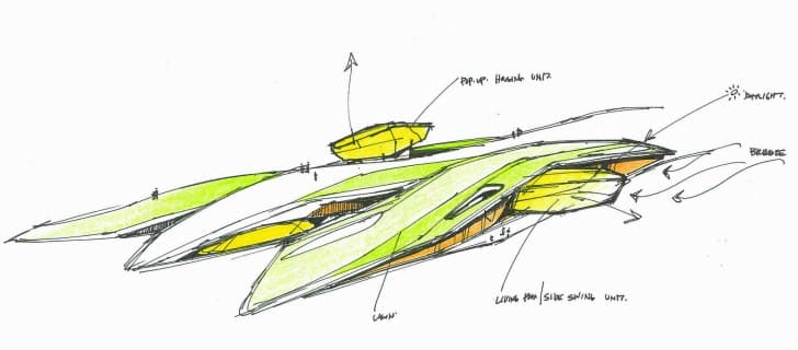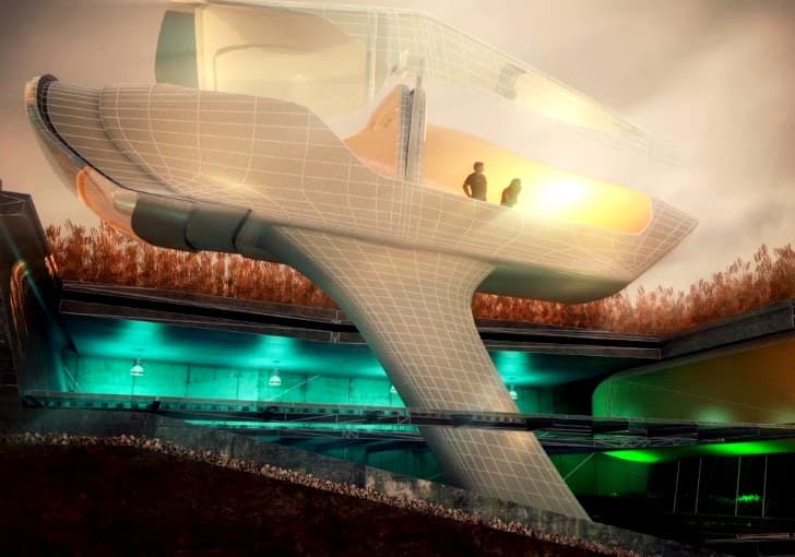 Por supuesto que esta idea está basada en mucha tecnología. Hay que aclarar que no todas las áreas de la vivienda están ubicadas en esta hermosa cápsula que se repliega. Las funciones más secundarias (servicios, almacenamiento,…) están en áreas fijas bajo tierra. La zona más vividera es la que está arriba, disfrutando del paisaje y el aire libre. Cuando existe el riesgo de fuertes vientos, se oculta al refugio mediante un conjunto de palancas hidráulicas. Después el techo se cierra sellando la entrada incluso al agua. Así que se trata de mitad arquitectura enterrada, mitad arquitectura móvil.