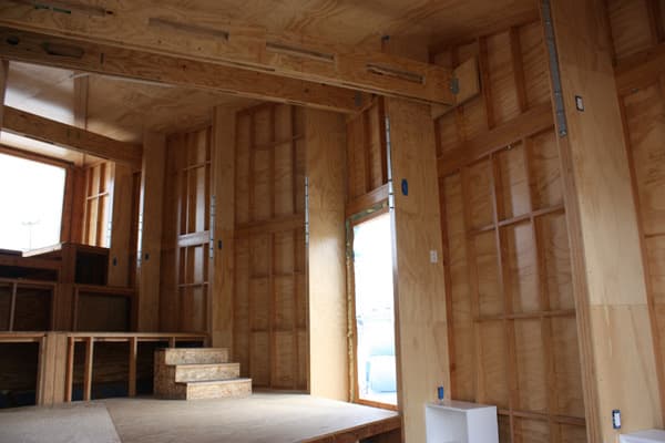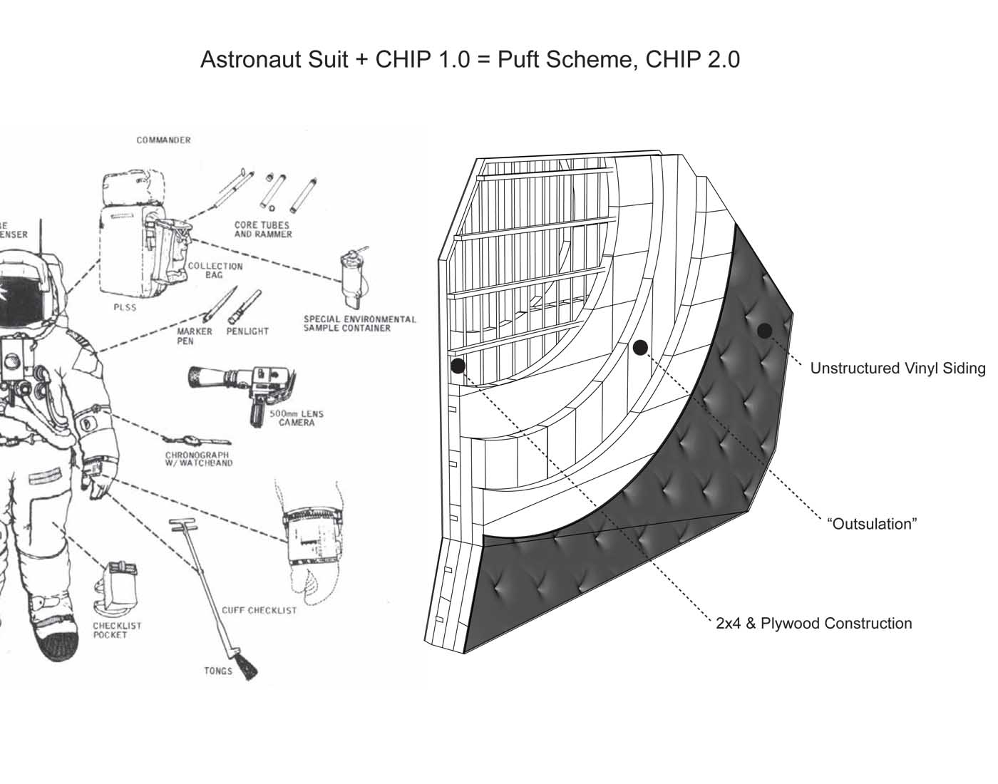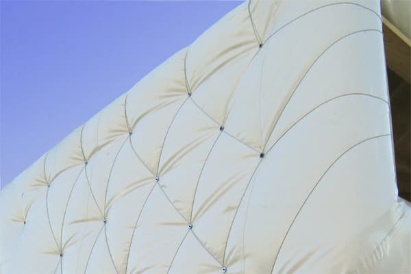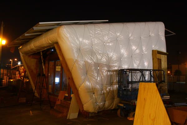 El aspecto más destacable de esta propuesta (y el más arriesgado) lo encontramos en su envolvente aislante. Para ello el equipo realizó ensayos sobre diferentes tipos de aislamiento, con el fin de probar su eficacia y estanqueidad. Al final se optó por gruesas mantas de material textil reciclado. La piel exterior está hecha con un revestimiento de vinilo tensado. Eso aporta a la casa una textura única, mediante una trama de ‘puntos de costura’. Es una clara inspiración en el traje de los astronautas.