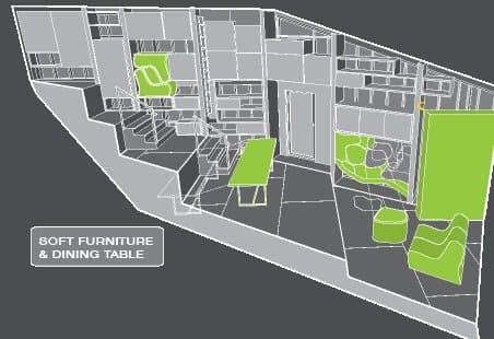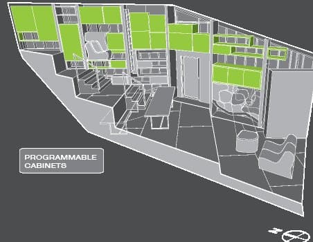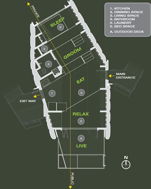 La organización dentro de la casa es también otro aspecto que la diferencia del resto de competidores. Sus 70m2 están distribuidos en casi un único espacio, y en 5 niveles diferentes. Cada una de sus plataformas corresponde a unas funciones muy definidas. De abajo a arriba encontramos: terraza, salón, cocina-comedor, y nivel que conecta con el baño. El dormitorio está en la zona más elevada. De manera muy acertada, aquellas partes que requieren de más privacidad se han situado en los niveles más altos. Pensamos que esta original disposición aporta a la casa una gran ventaja para controlar el aire interior. Pero también es cierto que se trata de una propuesta atrevida, que puede no ser bien valorada por el jurado. Hay puertas de acceso y salida muy bien situadas en el nivel intermedio. Durante el día hay suficiente luz natural que entra por sus grandes ventanales.