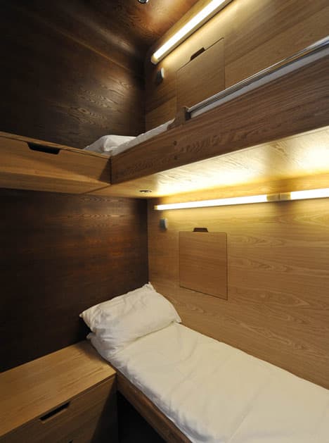 Junto a cada cama hay una mesita de noche con cajón, y tablero abatible en la pared para utilizarlo como un escritorio improvisado. Pero este modelo no incorpora algo que nos pareció perfecto: cama con cambio automático de ropa. Los responsables de la idea informan que esta habitación móvil prefabricada puede incluir luz ambiente sofisticada (LED) con cambio de color, pantalla de TV, monitor de pantalla táctil, conexión Wi-Fi, alarma, interfono, y caja fuerte. Las dimensiones exactas de este prototipo son de 2,5 x 1,6m en la base, y una altura de 2,5 a 3 metros.