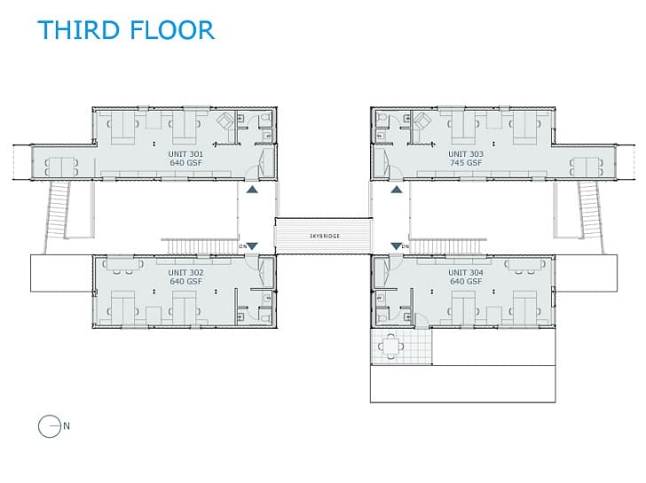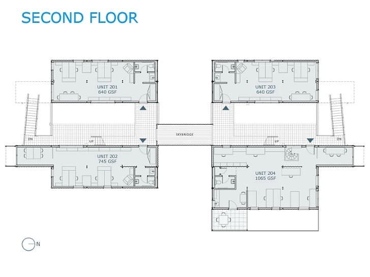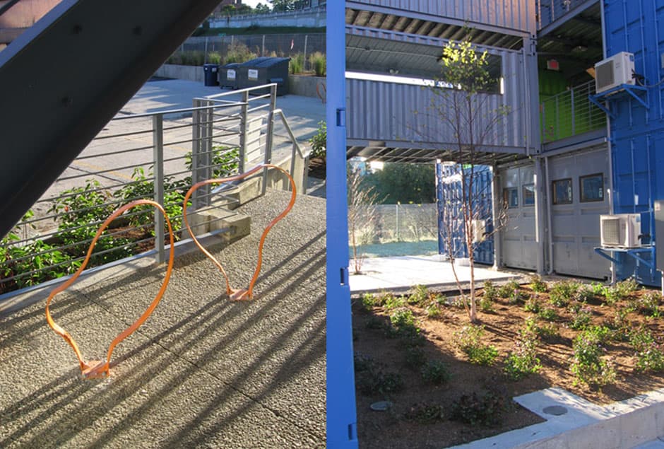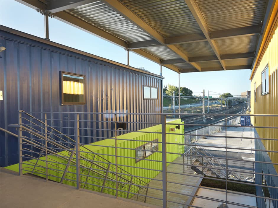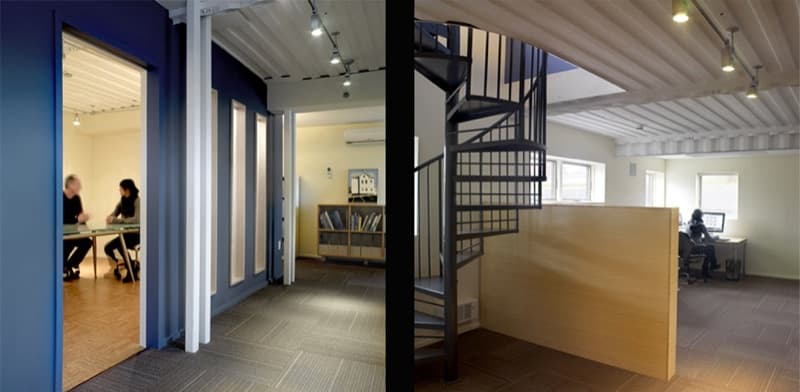 Como se puede ver en las fotografías, no se ha renunciado exteriormente al aspecto original del contenedor. Pero sí se pintaron en diferentes colores (predominando el azul). El aislamiento se proyectó en la cara interior, dejando luego las paredes con un acabado mediante paneles de yeso; los suelos tuvieron diferentes tratamientos. La organización está pensada para tener oficinas de todos los tamaños. Las hay con dos módulos de contenedor, hasta de cuatro, pero todas ellas con aseos propios. En la segunda y tercera planta se crearon unos espacios comunes abiertos.