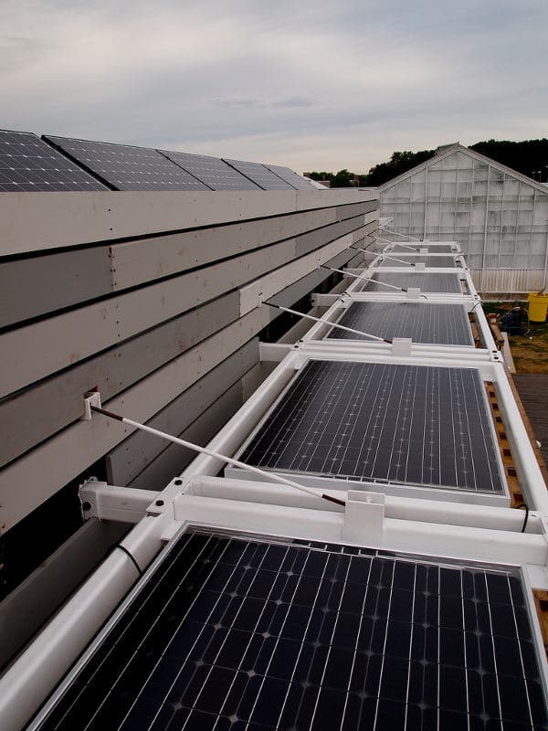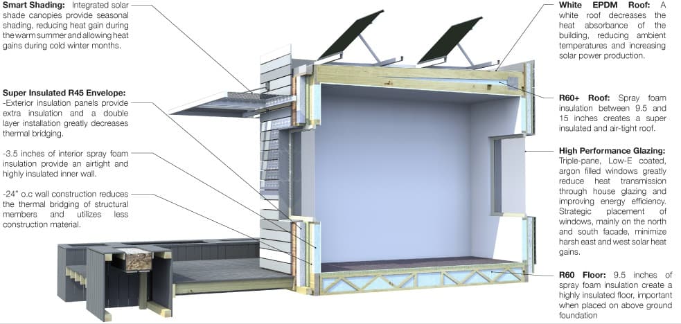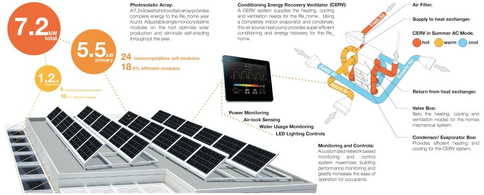 La instalación de paneles solares puede viajar ya montada en la cubierta plana de cada módulo. Luego en el sitio solo será necesario levantarlos hasta el ángulo óptimo. Además, en la fachada más expuesta al sol, la casa dispone de una marquesina formada por paneles fotovoltaicos, con una eficacia del 16.1% (18.5% en los de la cubierta). El interior de la vivienda se calienta o enfría con una bomba de calor, y un sistema de ventiladores se encarga del intercambio de aire entre el interior y el exterior. Tanto la climatización, como los recursos energéticos, son monitorizados mediante una aplicación para iOS (iPad).