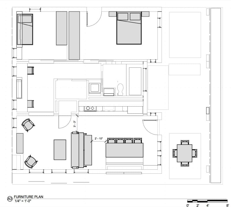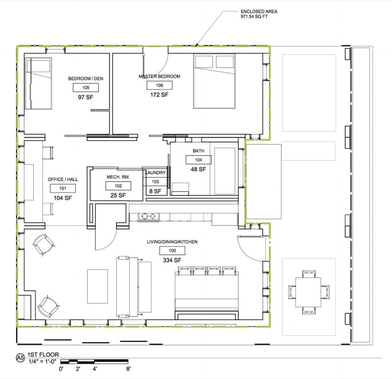 Viendo el plano de planta, es fácil comprender cuáles son los 3 módulos que forman su estructura. La disposición de sus habitaciones resulta un tanto desconcertante. Deja el salón demasiado estrecho, por ser éste zona de paso hacia el resto de las habitaciones. El cuarto de instalaciones queda en el núcleo de la vivienda, junto al lavadero; mientras que el cuarto de baño tiene una dimensión ajustada a las proporciones del resto de estancias. La zona de escritorio u oficina es en realidad un distribuidor (otro aspecto negativo), y en el dormitorio más pequeño se ha colocado una cama que durante el día queda plegada contra la pared.