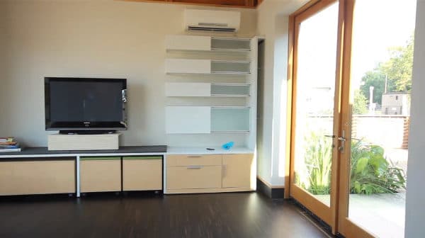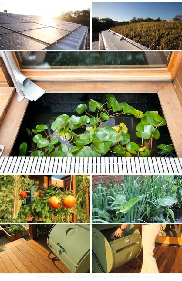 Su diseño incorpora dos placas de tubos de vacío para la producción de agua caliente, justo en un muro exterior. El resto de paneles solares (fotovoltaicos) están en una de las cubiertas, porque recordemos que la otra cuenta con un estupendo jardín.