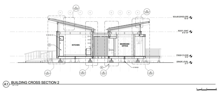 Viendo su plano de planta, es fácil comprender que el edificio está organizado en dos volúmenes similares. Uno para la zona de día, y otro para el dormitorio, el cual incluye un escritorio. Pero todo ese espacio puede funcionar como sala de trabajo, ya que la cama se convierte en una mesa. En el otro volumen está el salón, cocina, y comedor. Éste último dispone de unos interesantes muebles que se transforman en una estantería. El cuarto de baño queda entre ambos, con una amplia ventana hacia el humedal exterior.