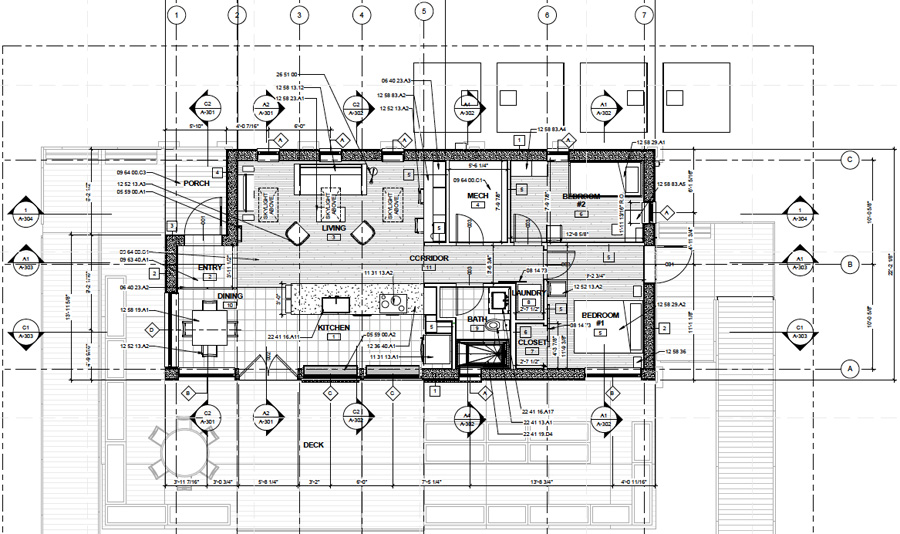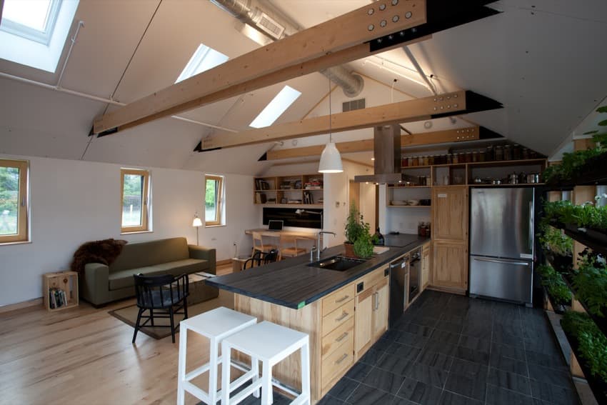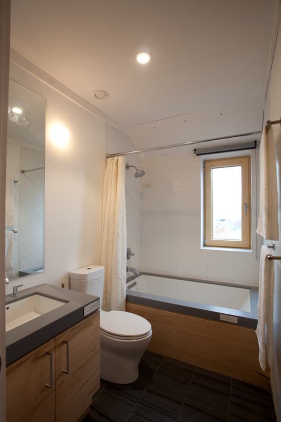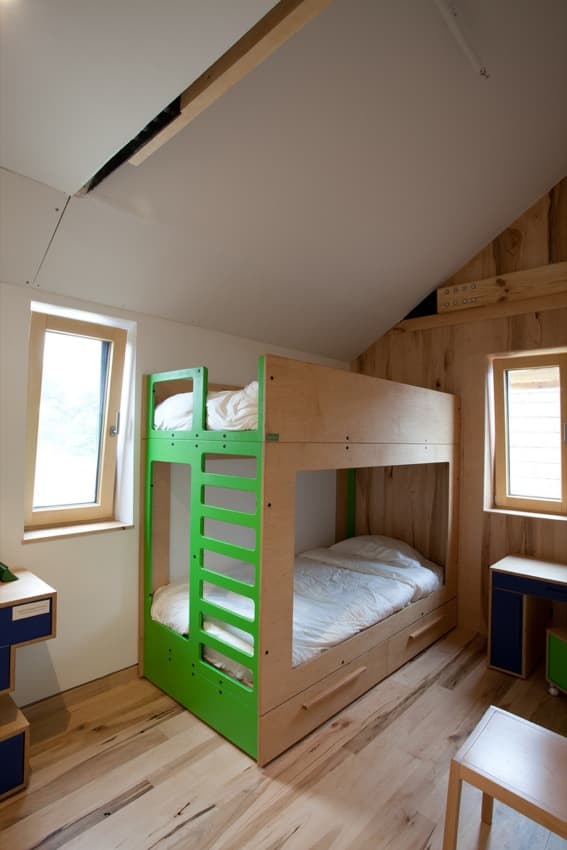 Esta vivienda solar está diseñada con una cubierta a dos aguas. Tiene una superficie de 92m2, suficientes para una familia de cuatro miembros (dos dormitorios). Su programa incluye un amplio espacio multi-funcional (salón, cocina, comedor y escritorio). En él destaca una gran isla de cocina, dejando el resto para el cuarto principal y el de los hijos; el baño y cuarto de lavadora están a un lado, y en el otro el cuarto de instalaciones. Justo encima de la entrada de la casa, se aprovechó el espacio bajo la cubierta (a modo de altillo) para zona de juego de los niños. El exterior ofrece un pequeño porche, y una amplia y soleada terraza, con jardineras para cultivo de alimentos.
