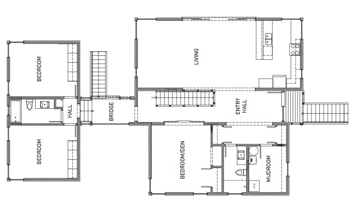 Este diseño está pensado para adaptarse a cualquier entorno, ya sea para colocar sobre un sótano, losa de hormigón, o encima de una planta existente (se supone que del mismo fabricante). Esta cabaña tiene una superficie de 168,25m2, estando formada por 5 módulos. Incluye 3 dormitorios y 2 baños, con una gran sala que contiene también la cocina y el comedor. Hay que señalar que hay varias opciones para el módulo -conectado por un puente- que tiene los dormitorios. Además se pueden elegir diferentes paquetes de personalización. De esta casa prefabricada lo que más nos gusta es su nivel de acabado, y la excelente iluminación natural.
