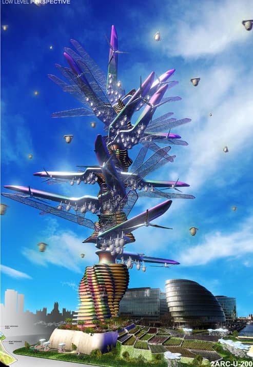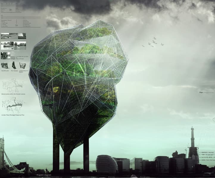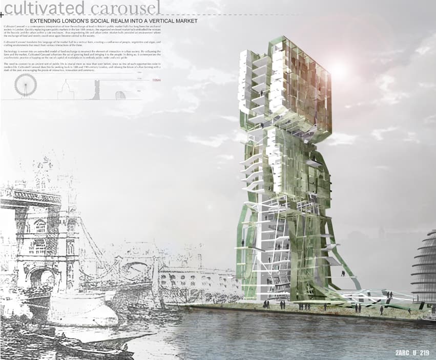 Estos renders corresponden a ideas nacidas del concurso LOFT 2011. Estaba organizado por AWR, y se buscaba un diseño de granja vertical para Londres, a orillas del Támesis. También había interés en saber qué materiales serían los más adecuados para una construcción de este tipo. La competición tenía por objetivo compaginar la granja con un uso residencial.