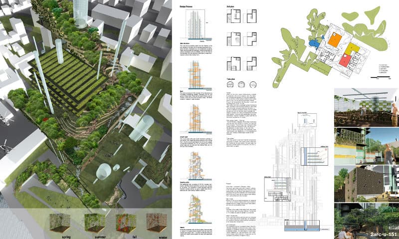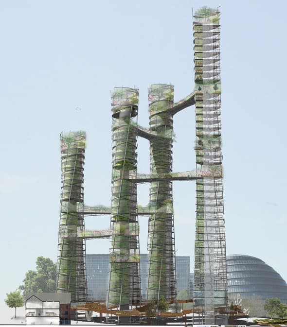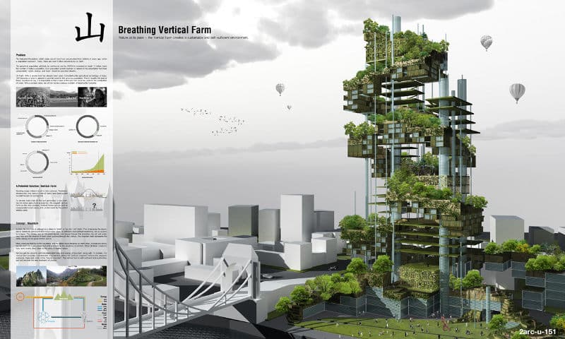 La opción ganadora llegó de un equipo de Corea del Sur. Se trata de una propuesta que funciona como un gran árbol con tres troncos. Pero nos cuesta trabajo entender dónde están las viviendas, y otras cuestiones que se nos plantean. En el lado opuesto, porque parece la más viable de todas, está el proyecto titulado «Breathing Vertical Farm» del equipo K2P (también de Corea del Sur). Recibió una de las menciones, y aquí en Is-Arquitectura fue absoluta vencedora, por eso encabeza este artículo.