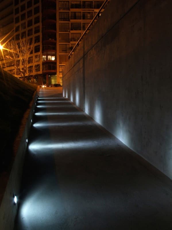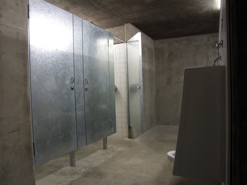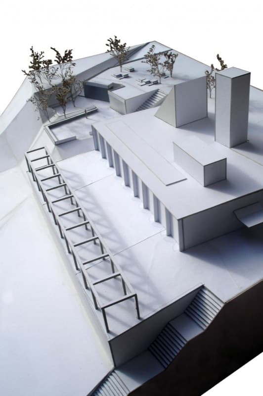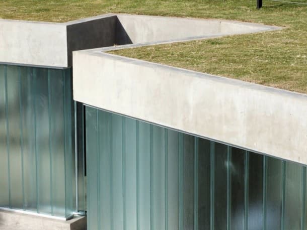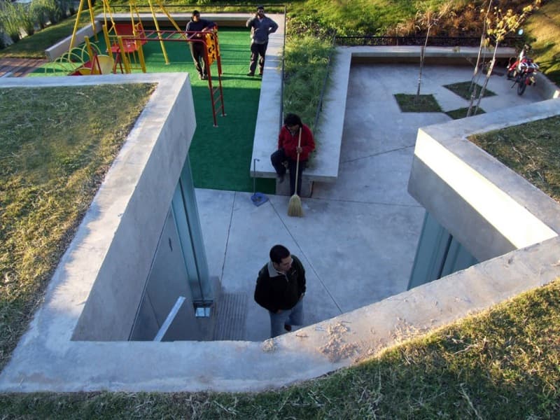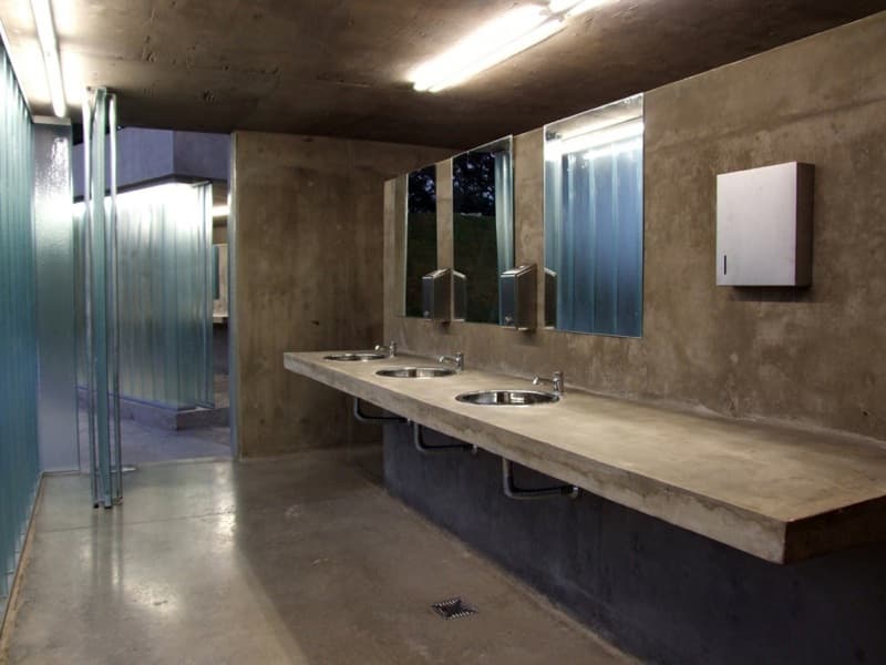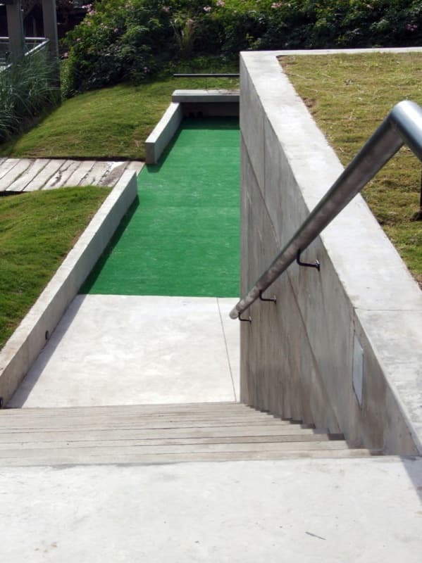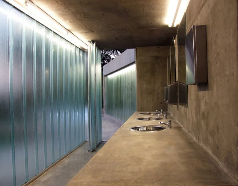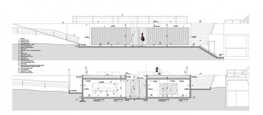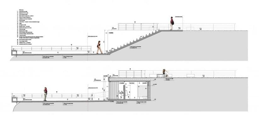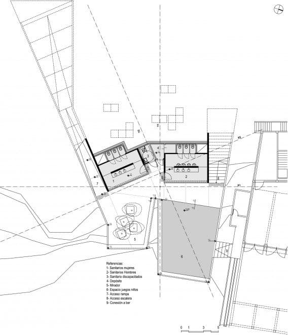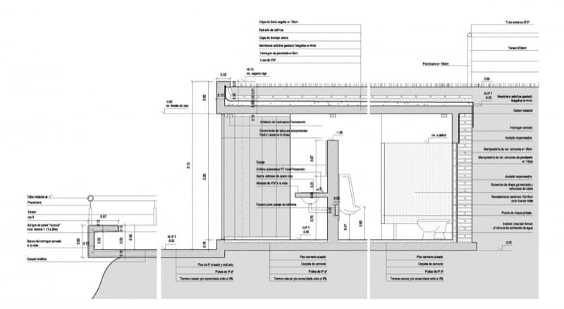 Desde la avenida se puede bajar a los aseos públicos mediante unas escaleras, o una rampa. Pero la obra también cuenta con un área para juego de niños, y un mirador (ver foto de la maqueta). Aparte del jardín superior, otro aspecto interesante del proyecto son los materiales elegidos para su ejecución. Se escogieron para resistir actividades vandálicas; por eso el acabado que predomina es el que aporta el hormigón visto; también hay divisiones de chapa galvanizada, suelos de cemento pulido, césped artificial en la zona infantil, y paneles de vidrio (U-Glass) en fachada. Estos últimos elementos aportan iluminación natural al espacio interior.