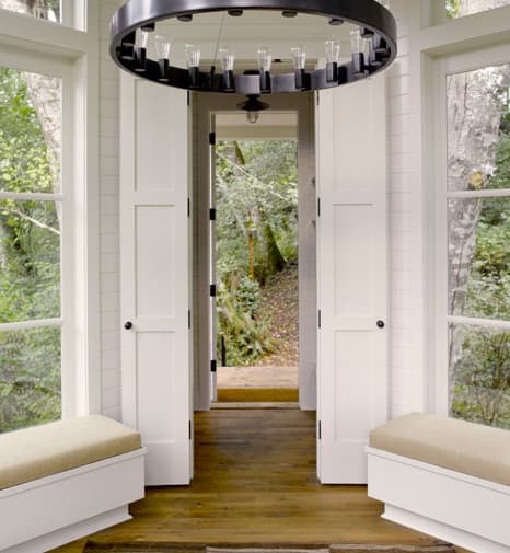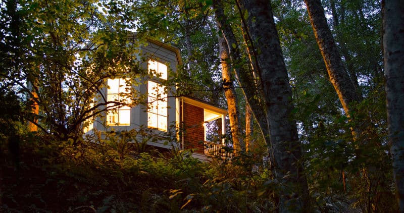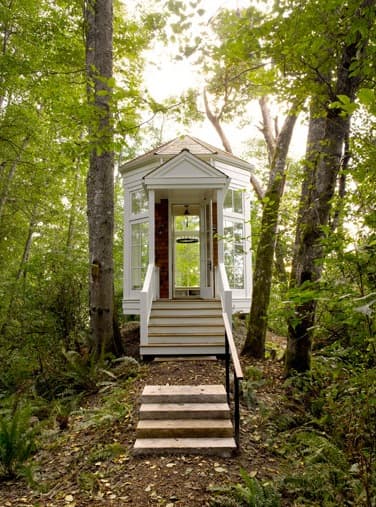 No es una cabaña, ni tampoco se construyó para funcionar como un refugio. Se la conoció por King Pavillion, y es simplemente un encantador pabellón de madera en medio de un bosque. Esta pequeña construcción forma un espacio de planta octogonal, con un porche en su entrada, y de fachadas acristaladas. Tenemos la suerte además de poder ver su interior, siendo bastante acogedor. Hay un banco corrido perimetral que también funciona como mueble para almacenaje.