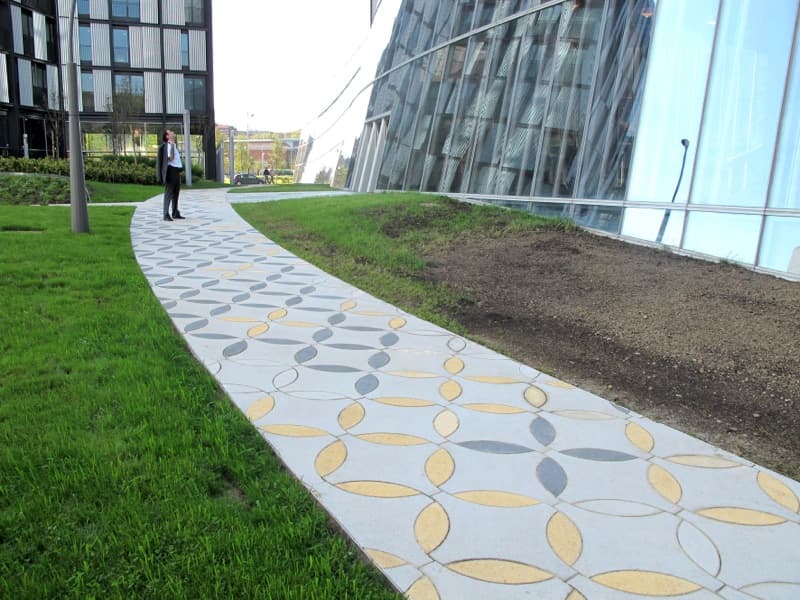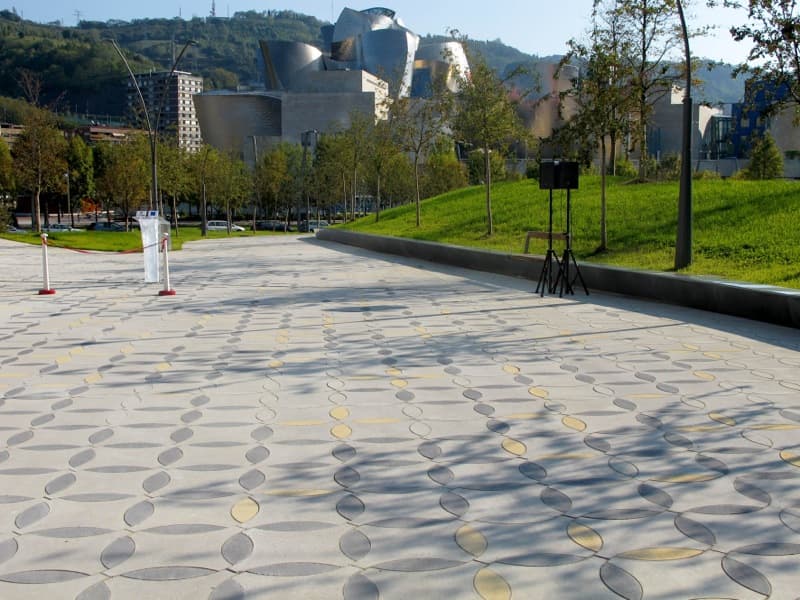 Estas imágenes se corresponden con un área que queda dentro del Parque de la Campa de los Ingleses (Bilbao, España). Es un espacio urbano ajardinado de 1,45 hectáreas, situado entre el Museo Guggenheim y la nueva torre de Iberdrola. El proyecto corrió a cargo de Diana Balmori y RTN Arquitectos. Pero lo interesante aquí es el pavimento ecológico utilizado en sus paseos, formado por baldosas Ecosit KlimCO. Este suelo está hecho con GeoSilex®, un aditivo para hormigones que absorbe CO2 del ambiente. Según su fabricante, tiene capacidad para absorber el equivalente al 50% de su peso. Eso quiere decir que un metro cuadrado (con un 8% de GeoSilex) puede llegar a capturar a lo largo de su vida útil el dióxido de carbono que haya en exceso en 5.000 metros cúbicos de aire.