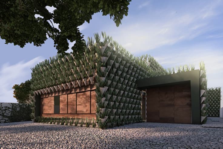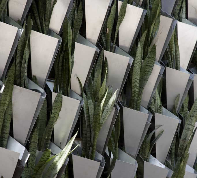 Todo el muro vegetal está compuesto por 9.000 plantas de la especie Espada-de-São-Jorge, que es una planta de origen africano -muy popular en Brasil-. Esta planta es resistente a condiciones exteriores desfavorables, y tiene un alto poder purificador del aire. Estas ‘Espadas’ están plantadas en bolsas de tierra metidas en unos pequeños depósitos de aluminio. Van colocados sobre una ligera estructura metálica anclada a la fachada. Lo que no tenemos muy claro es el sistema de riego empleado, si es que existe alguno, porque puede que esta especie vegetal no lo necesite.