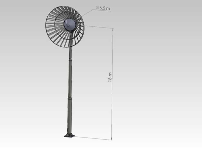 Estamos ante una turbina de eje horizontal que posee una capacidad de 20kW, para vientos medios de 9km/hora. Esa energía es suficiente para abastecer a unas tres casas, o una pequeña industria. Su bajo nivel de ruido y alta eficacia se explican por el novedoso diseño que tiene en forma de cono. Utiliza nada más y nada menos que 30 aspas unidas por varios anillos.