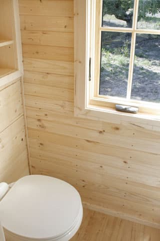 En líneas generales, esta casita está muy bien proporcionada. Su espacio está aprovechado al máximo, de tal manera que el aseo dispone de inodoro y ducha separada. El agua caliente la proporciona un calentador, situado bajo el fregadero de la cocina. No hay lavabo, pero se le puede instalar uno por encima del inodoro, al más puro estilo japonés. El inodoro consume poca agua, aunque se le puede poner uno de compostaje.