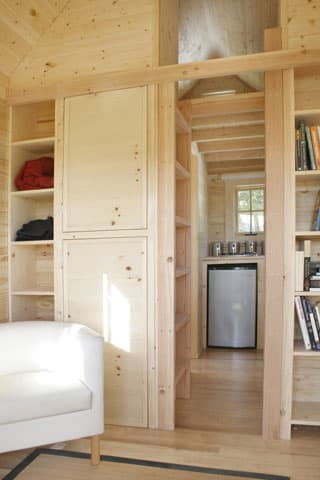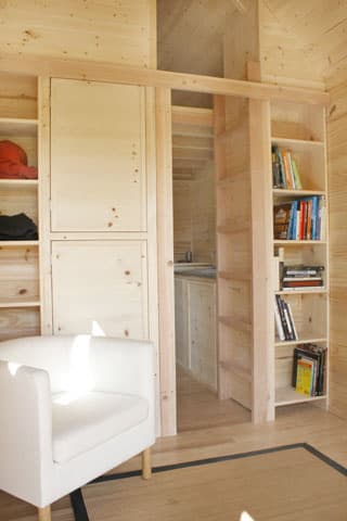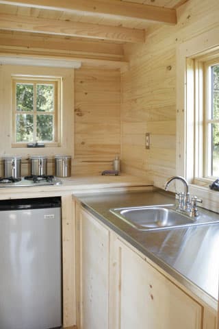 Toda la superficie de la cocina es de acero inoxidable, y viene equipada con fregadero, placa de cocinar con dos fuegos, nevera, y diversos estantes; debajo hay sitio para colocar un horno (o microondas), lavadora o lavavajillas. Como hemos señalado antes, el dormitorio está situado justo encima de la cocina y el baño, y tiene espacio suficiente para una cama de matrimonio. Todo el acabado interior es también de madera (pino), y justo en la entrada hay un pequeño porche. Esto último es bastante habitual en este tipo de construcciones.