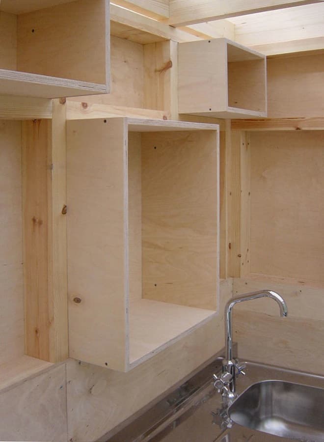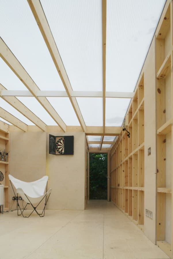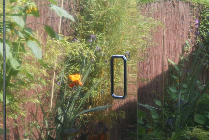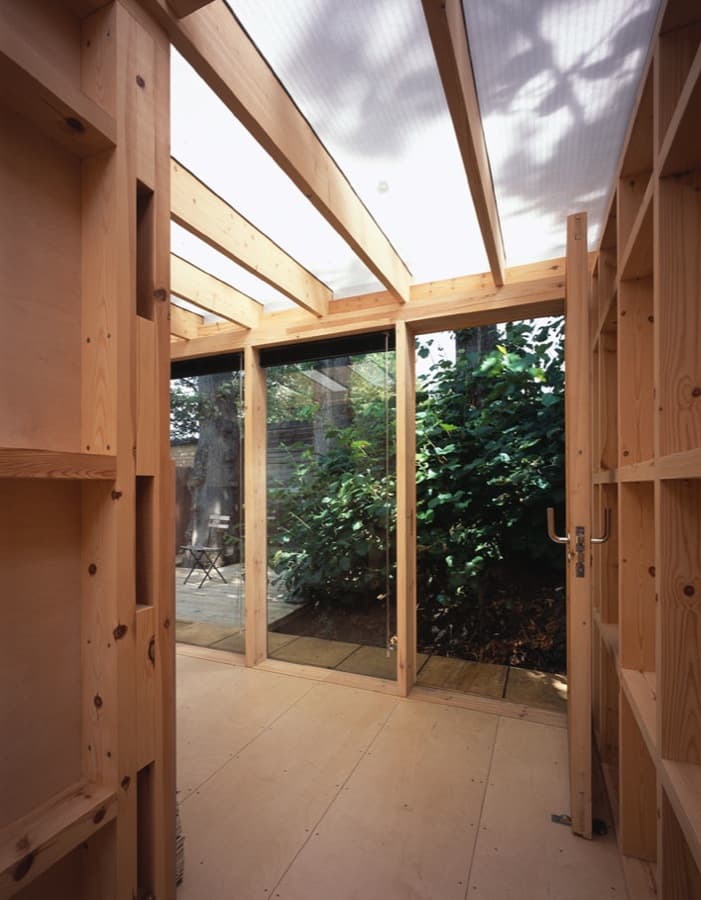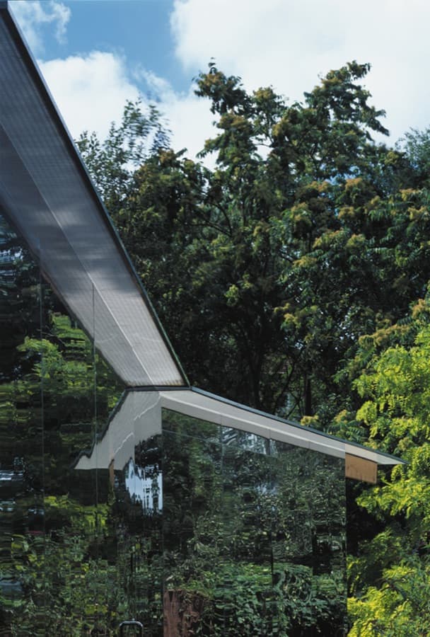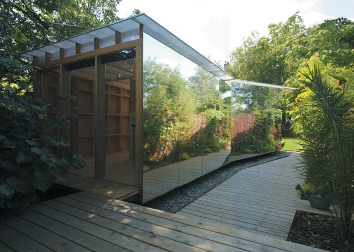 La estructura de este refugio urbano es de madera, pero se trata de una construcción de ‘pieles’ finas. Por eso no está hecha para protegerse, más bien para reforzar la presencia del jardín y las estaciones. Llama la atención la fachada lateral, que está revestida por un espejo de 8 metros de longitud. La delgada capa de la cubierta está formada por una lámina de policarbonato, permitiendo que todo el refugio tenga una buena fuente de luz difusa natural. Suponemos que se hizo así para facilitar los trabajos del artista. El refugio Summerhouse se construyó en 7 semanas, y con un presupuesto de 41.000€.