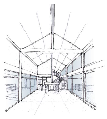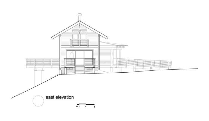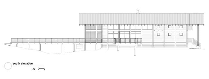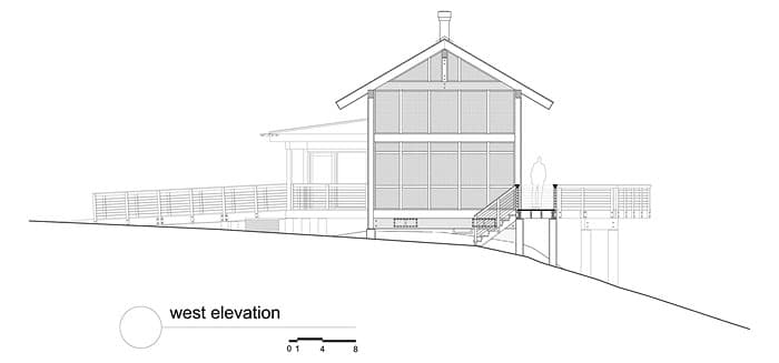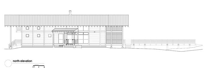 El impacto de este edificio se ha reducido construyéndolo 1.5 metros por encima del terreno. Para ello se utilizó un conjunto de pilares de hormigón, provocando que su acceso se tenga que hacer a través una pasarela. Esta vivienda es también interesante porque su diseño es muy sencillo. Tiene dos plantas, aunque la mitad de su superficie la ocupa un salón de doble altura (con cocina y comedor) presidido por una chimenea. Una escalera conduce a unos dormitorios bajo la cubierta inclinada, pero el dormitorio principal está en la planta baja.