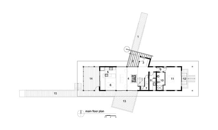 Según se puede ver en el plano de planta, el salón cuenta con dos terrazas exteriores, una de ellas está vincula a la pasarela de entrada. La otra pasarela que se puede ver conduce a un claro en el bosque cubierto de hierba.