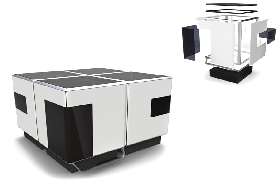 Su diseño incluye un vidrio inteligente que permite modificar el grado de transparencia en una zona de la fachada. Eso garantiza un espacio interior bastante luminoso, y una privacidad apropiada a sus ocupantes. La única manera de que en un espacio tan pequeño se pueda cocinar, comer y dormir, es utilizando mecanismos transformables. Los utilizados en la estructura M_Cube se inspiraron en la maravillosa casa PACO. Un buen ejemplo de ello es la manera de crear la mesa y el asiento que se ve en una de las imágenes.