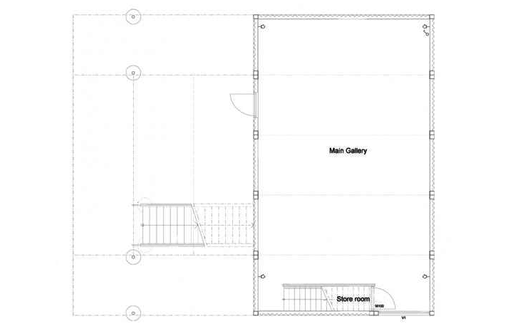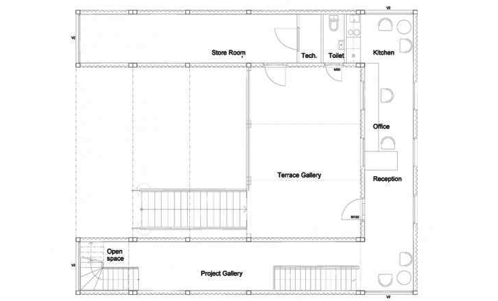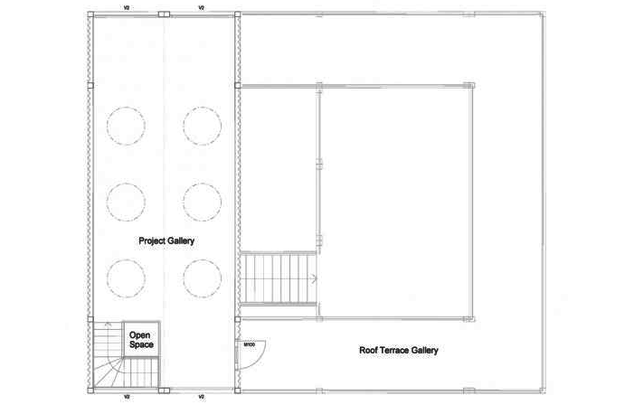 La planta baja está compuesta por cinco contenedores, para crear el espacio principal de la galería; el segundo piso se organiza en forma de U con tres módulos, dejando un patio central. La planta superior la componen dos contenedores, que están apoyados en sus extremos sobre los del piso inferior. Todos están aislados y revestidos interiormente con paneles de madera contrachapada y yeso. Fueron pintados de blanco para facilitar al máximo las cualidades expositivas del recinto. Para dar aún más luminosidad natural, algunos tienen unas claraboyas practicadas en su cubierta, además de todo el frontal acristalado. Interesante también fue comprobar que los espacios al aire libre se utilizaron como superficie de exposición.