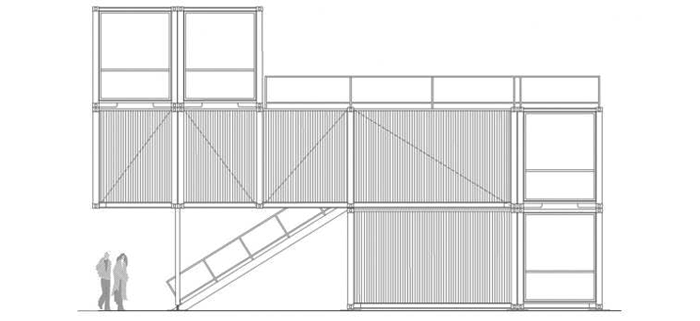 Es evidente que un edifico con esas funciones resulta ideal para una arquitectura con contenedores. Pero en esta ocasión se aprovechó al máximo la resistencia que tienen estos módulos para formar una estructura apilada. Algunos de los contenedores se dejó en voladizo, siendo tan solo necesario añadir unos cuantos soportes al conjunto.