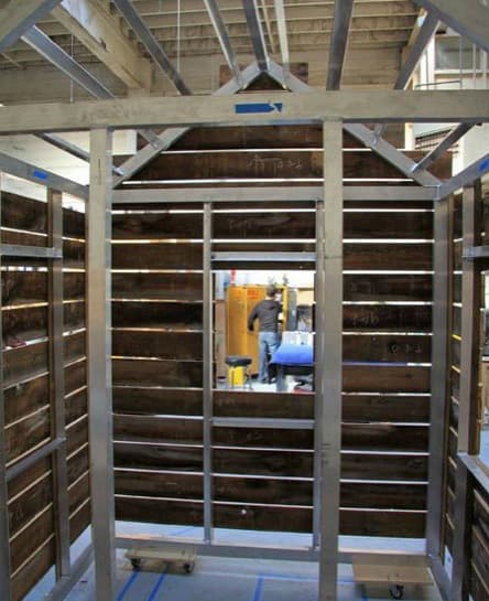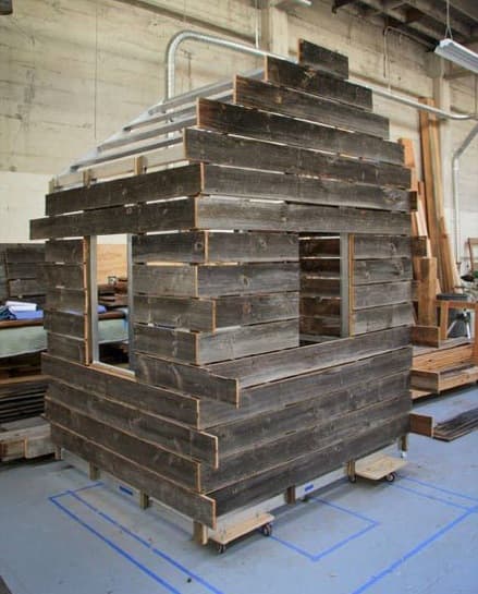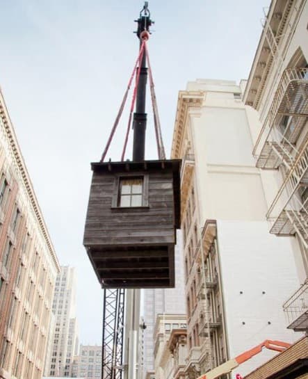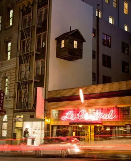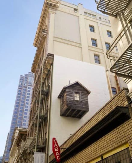 Esta pequeña cabaña rústica de madera se colocó en una céntrica calle de San Francisco. La imagen se incluyó en nuestra particular colección de refugios en paisajes. Se construyó según sus autores como «un homenaje al espíritu romántico del mito occidental, y a la arrogancia de la expansión hacia el oeste«. Para nosotros es ante todo una anecdótica curiosidad urbana, colocada en la fachada medianera del Hotel des Arts, y encima del restaurante Le Central.