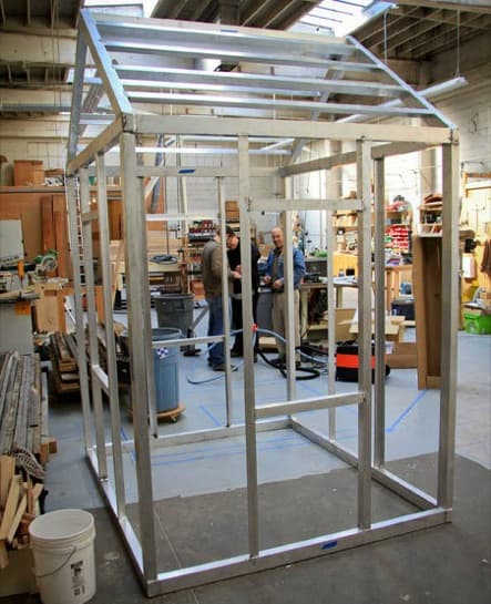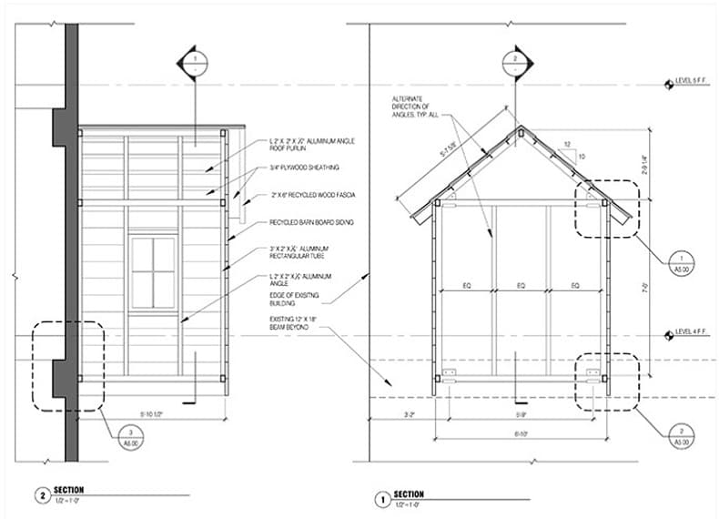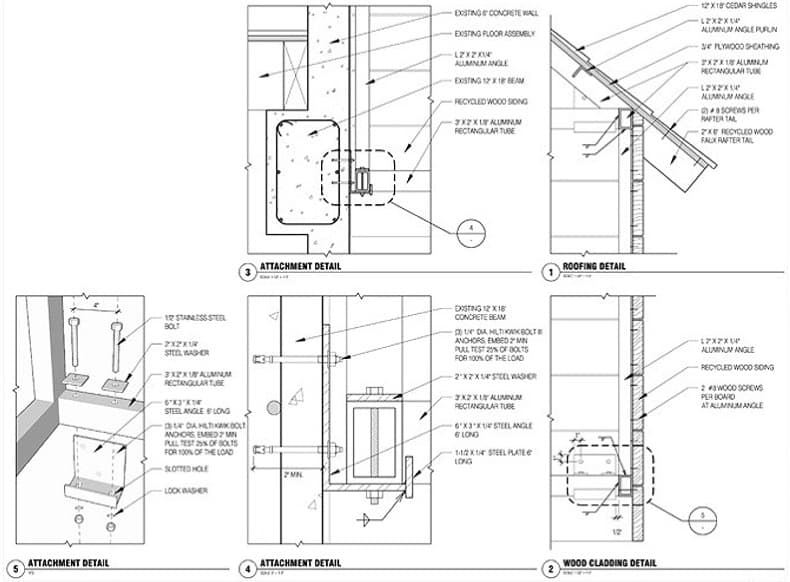 Y no, no se trata de una habitación extra para ampliar la capacidad de alojamiento. Es simplemente una expresión artística ahí colgada, porque en realidad es una ligera estructura metálica revestida de madera. De su interior tan solo se pueden ver la cortinas de sus ventanas, aunque de noche es aún más impactante, por la luz que hay dentro. Se han añadido fotos de su construcción y algunos planos, con el fin de despejar todas esas dudas que a uno se le pasan por la cabeza al ver cosas de este tipo.