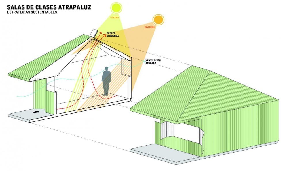 El motivo principal de este proyecto era servir de aulas para los niños afectados por un terremoto de 8.8 en Chile (febrero del 2010). Además debía ser una ayuda a las escuelas de enseñanza que se pudieran ver afectadas por situaciones de emergencia. Su financiación se realizó con donaciones de empleados de la empresa Holcim Latino América, y la compañía de Cementos Polpaico Holcim. Pero su aspecto constructivo es también muy interesante, ya que está diseñado para ser copiado y montado con facilidad en otras regiones del país. El proyecto recibió el nombre de Atrapaluz, y se hizo respetando una serie de características sustentables/sostenibles.
