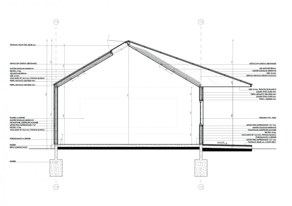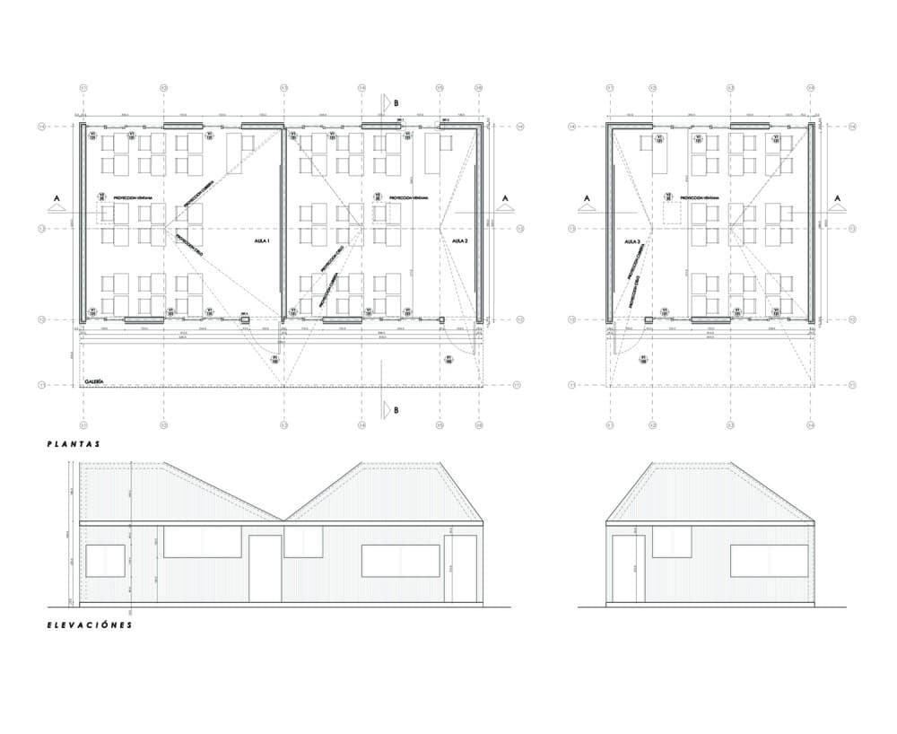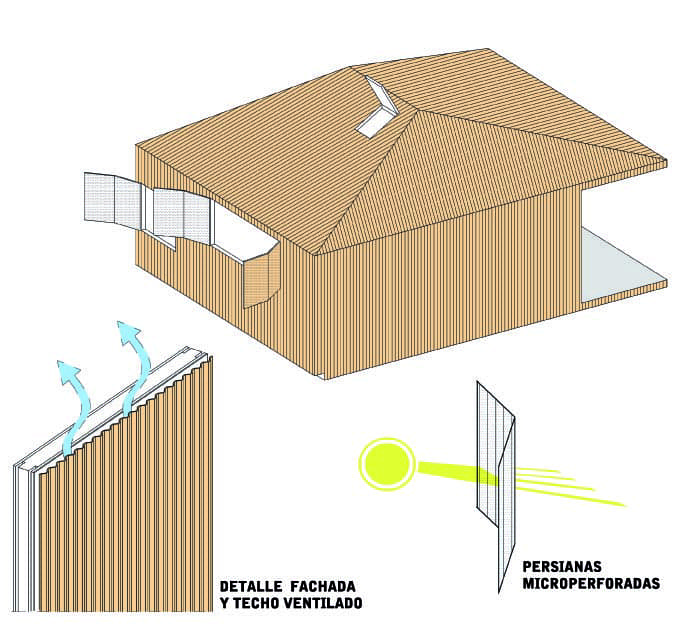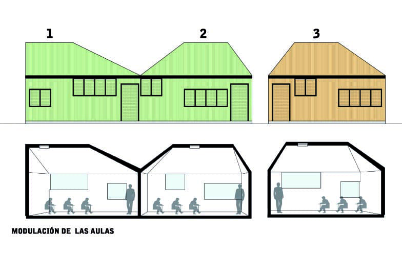Estas aulas responden a un planteamiento de arquitectura prefabricada de sencillas soluciones constructivas. Alcanza una buena eficiencia energética con materiales locales, con una altura libre por encima de la habitual, y un revestimiento exterior con fachada ventilada de Hunter Douglas (muros y cubierta). La incorporación de claraboyas Lucarna Velux en los tejados hace que el interior se vea aún más luminoso. Ese detalle aporta cierto ahorro energético en iluminación, y una mejor regulación de la temperatura, tanto en verano como en invierno. Los paneles SIPs empleados tienen 11 centímetros de material aislante, y las persianas en ventanas poseen una transparencia del 40% (material perforado).
