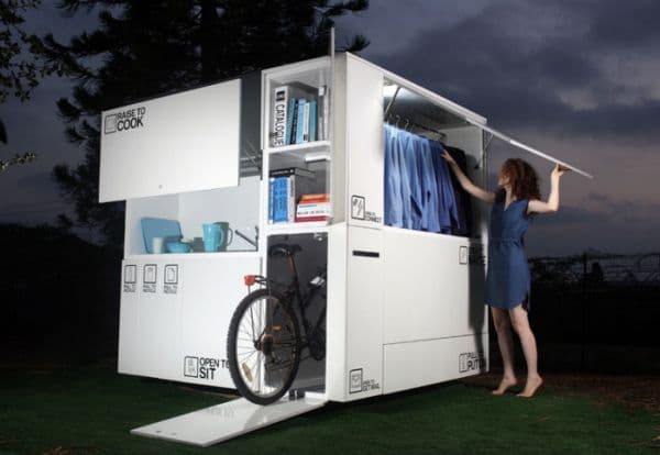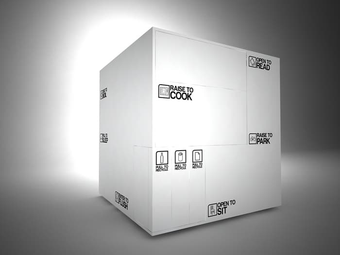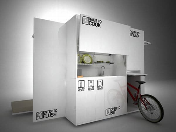 Esta pequeña estructura es un cubo perfecto de 2 metros de lado, que cubre las necesidades mínimas de una persona. En él se han cuidado tanto el espacio de almacenaje, como las funciones que ofrece. El cubo CHU viene con una cama plegable, ducha, inodoro, cocina, y armario para guardar la ropa. Incluye diferentes compartimientos de almacenamiento (incluso para una bicicleta), y hasta un escritorio abatible. Suponemos que esta compacta estructura puede conectarse a una red de abastecimiento y saneamiento, aún así dispone de un depósito de agua.