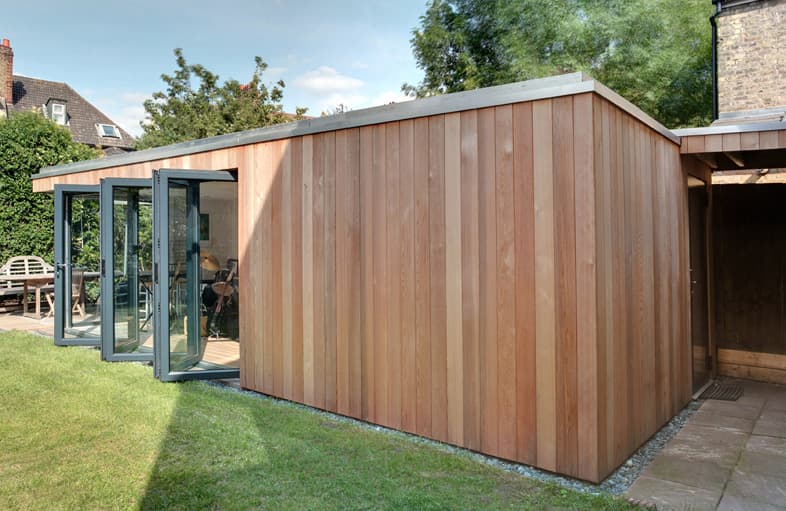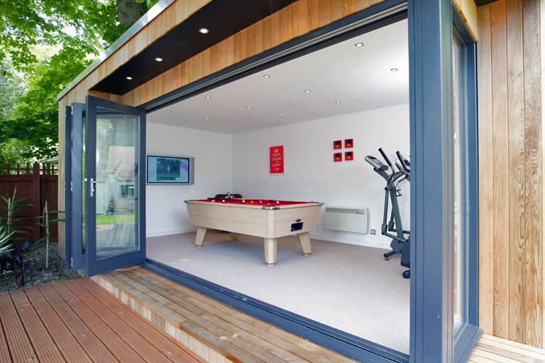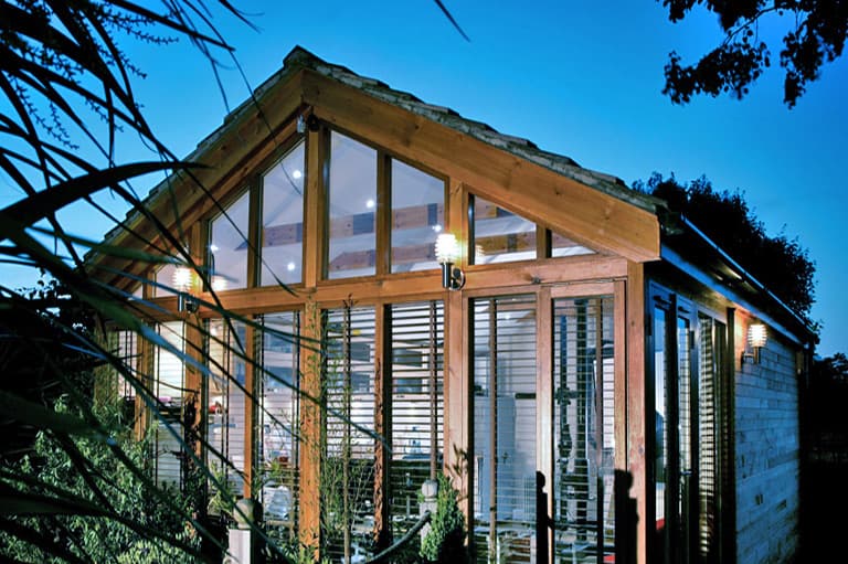 Si se quiere una solución especial, Studioni ofrece la colección «Garden Lodge», caracterizada por tener cubierta a dos aguas, en 5 tamaños diferentes a partir de 4 x 5 metros (3,6m de altura). Esta opción es más cara que las anteriores, ya que viene con tejado de pizarra, claraboyas (opcionales), están preparadas para tener cuarto de baño, pueden tener persianas venecianas en las ventanas, y luces por control remoto.