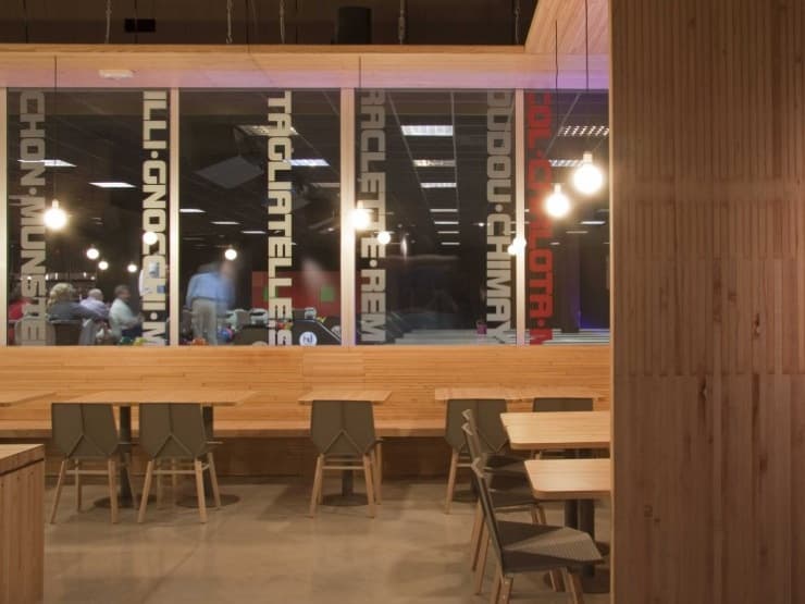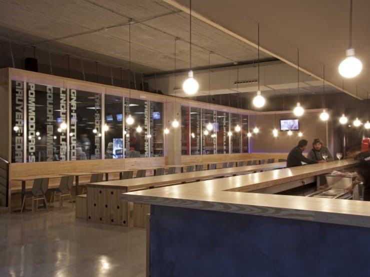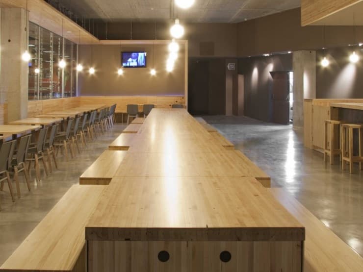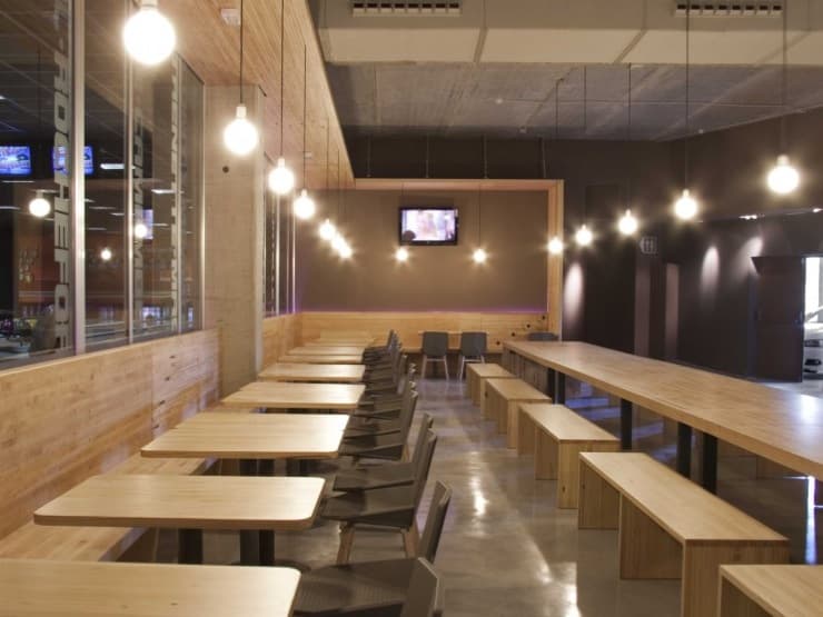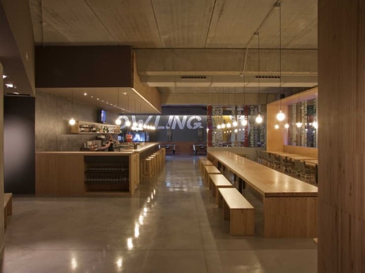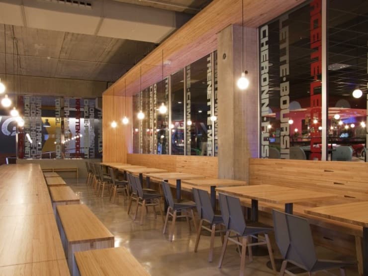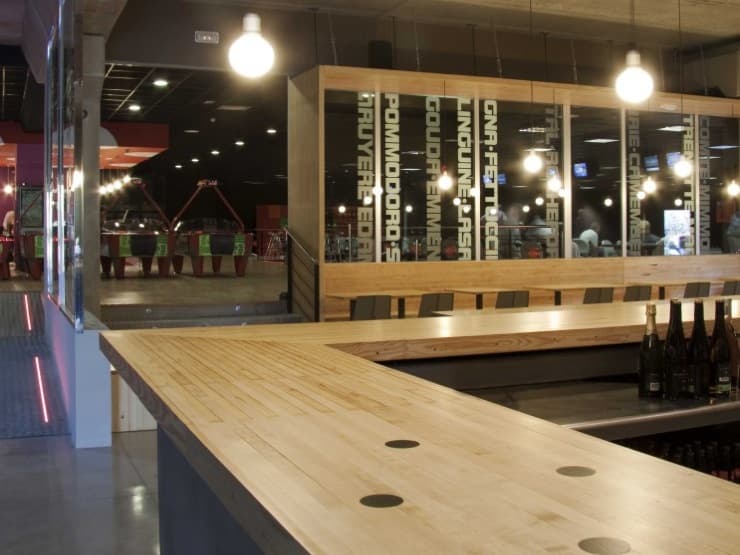 No es un error que escribamos sobre el proyecto de un restaurante en este blog. Aunque su diseño no está nada mal, lo hacemos por la austeridad y cuidado en la elección de materiales. En este sentido, un punto muy destacable es su mobiliario: hecho recuperando madera. Se trata del Restaurante Ozone, que está ubicado en un centro comercial de Moraira (Alicante, España). Es un lugar costero con una importante población de jubilados extranjeros. En este local se combina el ocio del bowling con el de la restauración, con el fin de darle un carácter más adulto. Para llevarlo a cabo se recuperó madera maciza de pistas de bolos originales. Con ella se realizó gran parte del mobiliario: mueble de banco corrido (incluido su techo), gran mesa central, la barra del bar, además del mueble de servicio de los camareros.