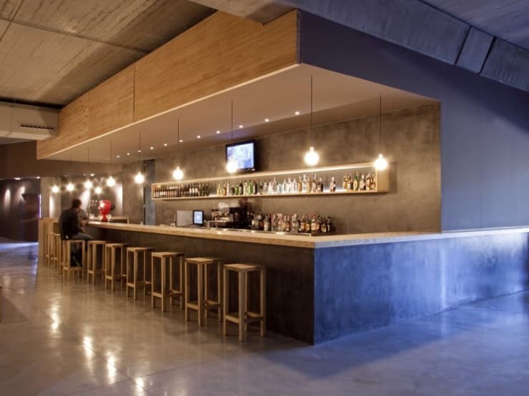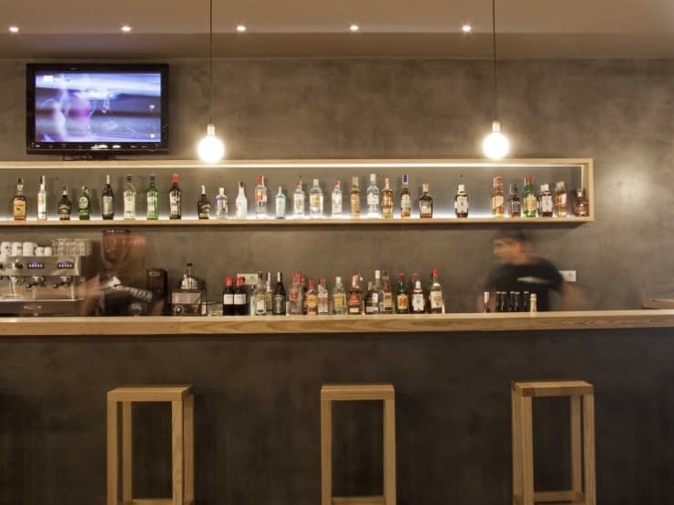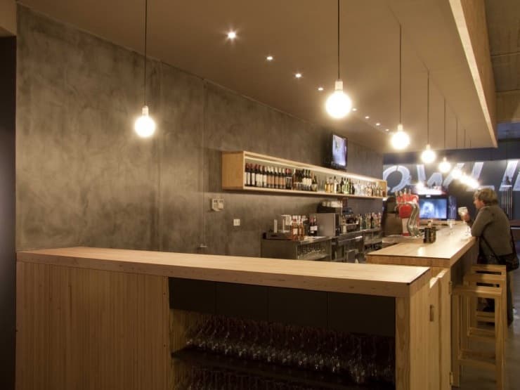 Como el suelo es de hormigón fratasado, los paramentos del bar y de su barra se han revestido con Tecnocemento. De esa manera se mantiene una textura muy parecida. Destacar también que las sillas son diseño de Mariscal (Silla Green). Es un modelo reciclable hecho con polipropileno reciclado (100%). El resultado final es el de un local acogedor en el que se he tenido en cuenta la sostenibilidad.