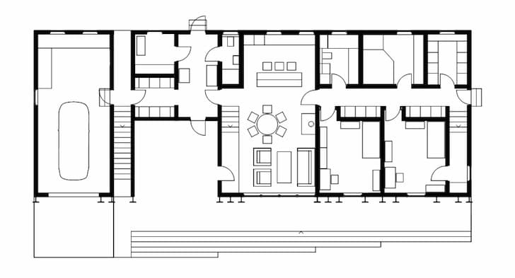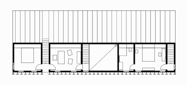 Villa Mirror Mongayt es también una vivienda eficiente energéticamente. Está construida sobre una losa de hormigón armado, con estructura prefabricada de madera local, y aislamiento a base de eco wool. No hay muchas imágenes de su interior, pero sí están los planos de planta en los que se puede apreciar su organización tan lineal.