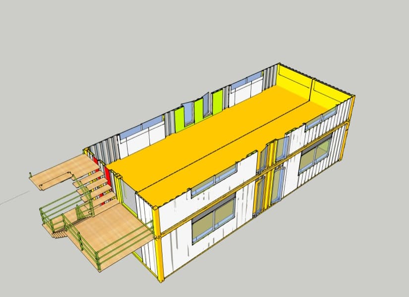 Para su construcción, se utilizaron 6 contenedores ISO de 40 pies. Los containers están apilados, formando una estructura de 3 plantas (dos contenedores en cada nivel). Van unidos longitudinalmente para crear espacios interiores de anchura suficiente para su uso, con una superficie por piso de 57,6m2. El acceso a cada aula se hace mediante una escalera metálica exterior.